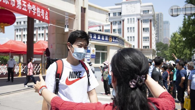 7月7日,在山西省太原市第五中學校考點,結束首場科目考試的考生走出考場。