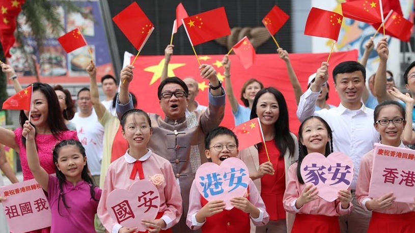 7月1日,香港市民在太平山頂廣場唱國歌。