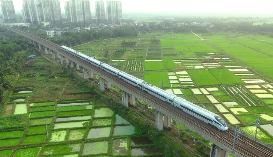 2020年3月17日,海南環島鐵路一列動車從春光明媚的瓊海城區經過。