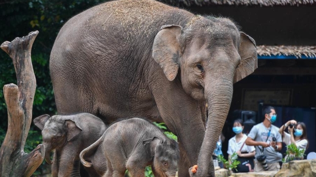 正在享受竹子大餐的廣州長隆野生動物世界大熊貓婷仔被大熊貓隆仔搶食,兩只大熊貓上演一場爭食戲碼。