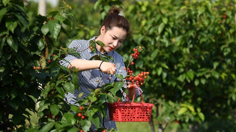 近日,安徽省肥西縣豐樂鎮鳳嶺苗木種植扶貧產業園里10多畝櫻桃進入采摘期,農民忙著采摘櫻桃,供應市場。