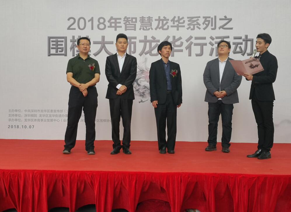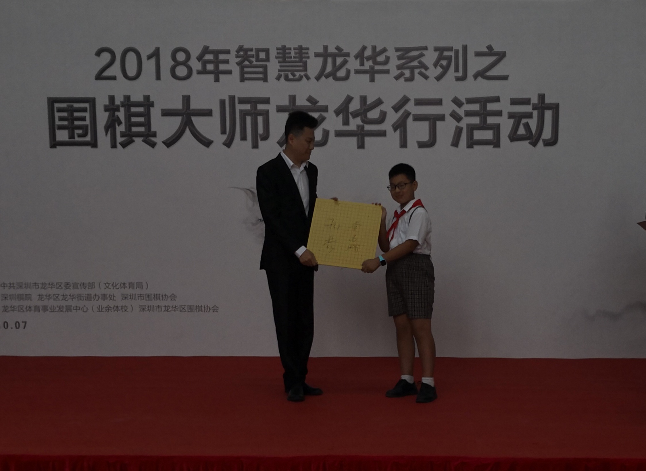 開幕式上,龍華區(qū)委副書記苗寧禮,龍華區(qū)委常委、宣傳部長黃啟鍵及區(qū)文化體育局相關(guān)負(fù)責(zé)人等在百忙中前來為“智慧龍華”捧場加油。活動在輕松熱鬧的歌舞中拉開帷幕,文化體育局負(fù)責(zé)人在致辭中對諸位圍棋大師的到來表示熱烈的歡迎,對活動擴大中華圍棋文化的傳播,推動龍華區(qū)圍棋的發(fā)展給予了充分的肯定。隨后,黃啟健常委代表龍華區(qū)聘請李昌鎬大師擔(dān)任龍華區(qū)圍棋發(fā)展的名譽顧問并頒發(fā)了證書,李昌鎬則回贈了簽名棋盤。緊接著,孔杰老師也給參加活動的小棋手贈予了簽名棋盤。在廣東圍棋總冠軍佟云老師簡要介紹李昌鎬、孔杰的精采圍棋經(jīng)歷之后,活動主持人還現(xiàn)場采訪了李昌鎬、孔杰,就兩人圍棋從業(yè)過程中的難記經(jīng)歷、精采賽事以及對人工智能圍的展望等進行了提問,兩位大師的回答坦率、誠懇,贏得了現(xiàn)場觀眾的陣陣掌聲?;顒拥母叱笔抢畈€、孔杰、車澤武、張亞博四位老師與龍華區(qū)的圍棋愛好者進行多面打的活動,梁偉棠九段和徐瑩老師還進行掛盤講解。