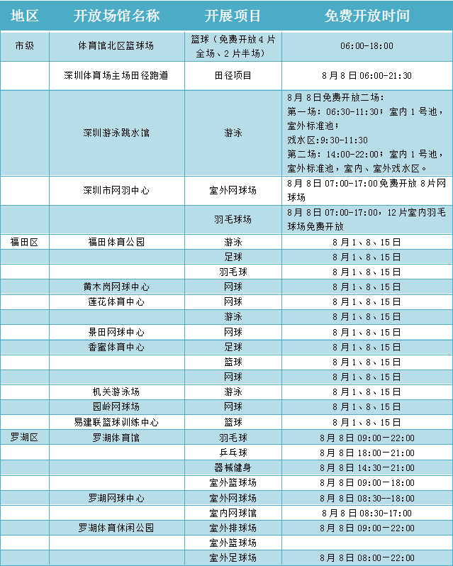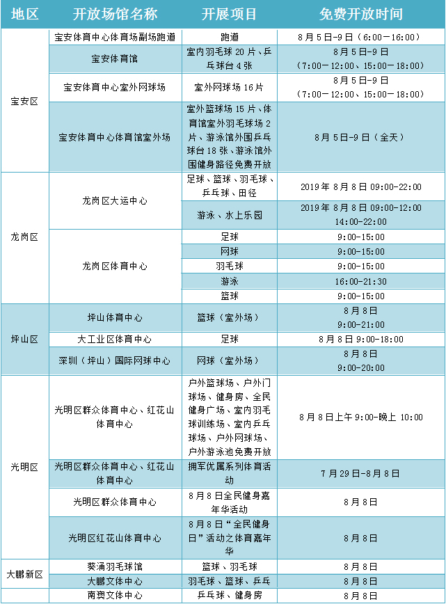 在“全民健身日”期間,深圳舉辦“全民健身嘉年華”及各類市級健身賽事活動16場,各區、各相關單位也結合實際,組織推出80余場全民健身運動,如面向全市市民的大型國民體質監測和健身咨詢活動、全民健身大講堂活動等。各級社會體育指導員也將開展義務健身輔導,利用豐富的體育專業技能,向廣大群眾講解健身知識,推廣健身方法,普及科學健身理念,為全民健身活動提供技術指導服務。8月8日“全民健身日”當天,深圳市體育中心以及各區體育場館,也將免費向市民或單位開放。