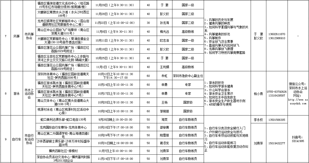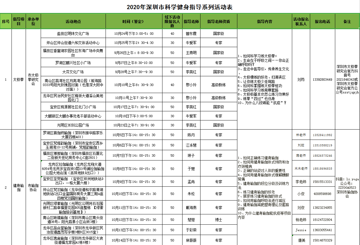 專題會現場,15家體育社會組織機構發揮各自優勢,建言獻策各展神通。經統計,即日起至11月29日,15家體育社會組織機構將通過媒體宣傳、微信公眾號、官方網站、線上點播直播、深入社區及走進公園等方式,在全市各區開展運動防損傷、運動基礎知識及要領、實地練習等123項系統性的科學健身指導活動,內容涵蓋沖浪、瑜伽、航空航海、跑步、秧歌、網球、極限及居家運動等十余種常見運動。具體活動安排與參與方式可詳見文末圖片。