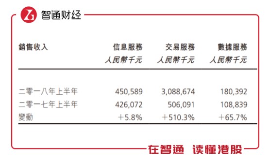 板塊方面,交易板塊是此次營收貢獻的主力軍,共為總營收貢獻81.5%的銷售收入。上半年,交易服務板塊營收入約30.9億人民幣,較去年5.06億增長約510%。信息服務板塊營收約人民幣4.5億,同比增長5.8%。數據服務板塊則貢獻營業收入約1.81億元人民幣,較去年1.09億增長66%。利潤率方面,信息服務增長7.12%,交易服務增長188.5%,數據服務增長23.45%。