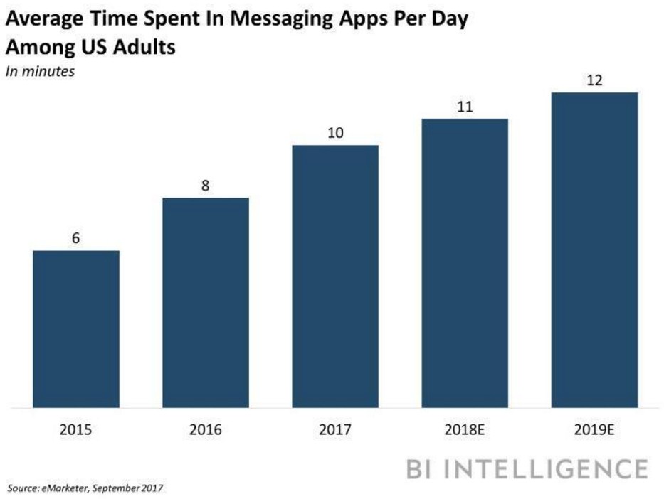 據市場研究公司eMarketer的統計數據顯示,去年,美國消費者平均每天在一款通訊應用上逗留的時間是10分鐘,較2016年的8分鐘增長了15.2%。這個平均逗留時間在今年有望增長到11分鐘,在2019年有望增長到12分鐘。