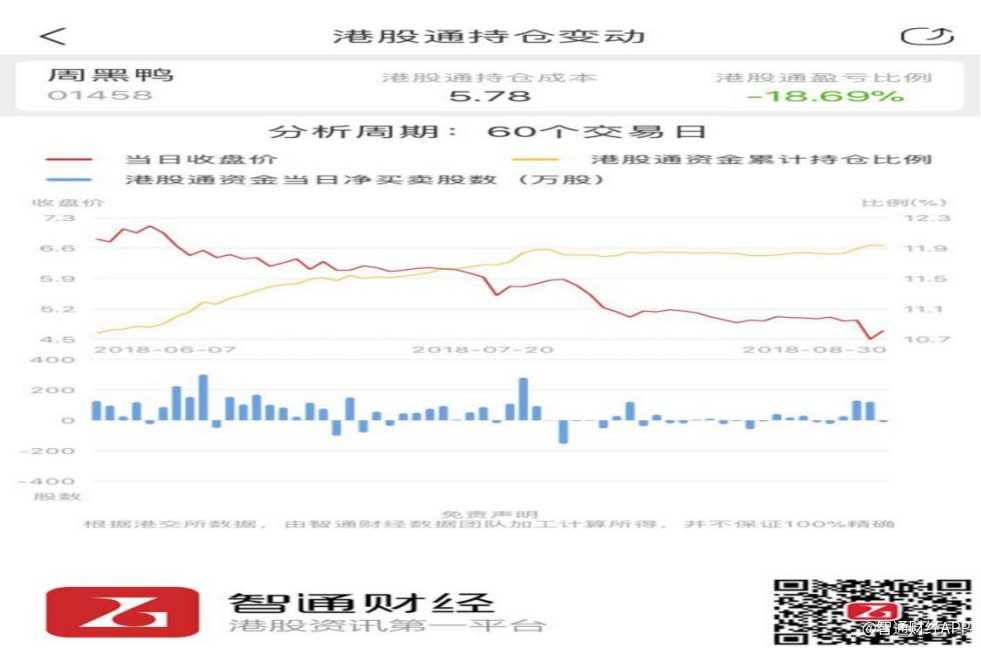 不僅如此,根據智通財經APP的數據,近三個月以來內地資金持續通過港股通渠道加倉周黑鴨,與公司股價下行趨勢形成明顯的背離。