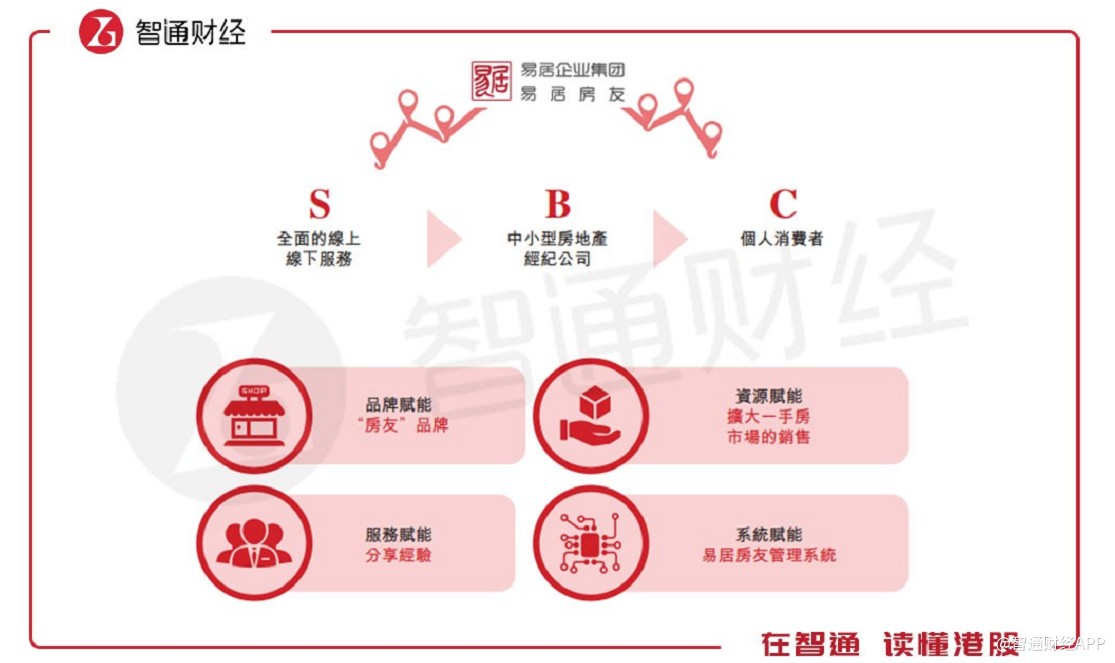 易居房友S2B2C的模式之新在于它不直接開展二手房經紀業務,也不開設二手房經紀公司,而是賦能并整合房友品牌下的中小微房地產經紀公司,向中小微房地產經紀公司(B)提供在線線下綜合服務(S),以幫助其更好的服務個人客戶(C)。
