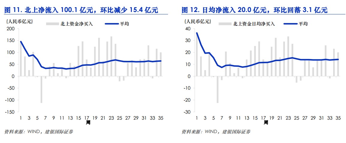 而另一方面,北上資金連續呈現大幅凈流入,伴隨成交量上升。流入100.1億元人民幣,環比減少15.4億元,仍明顯好于南下資金。日均凈流入20.0億元,較前期回落 3.1億元。