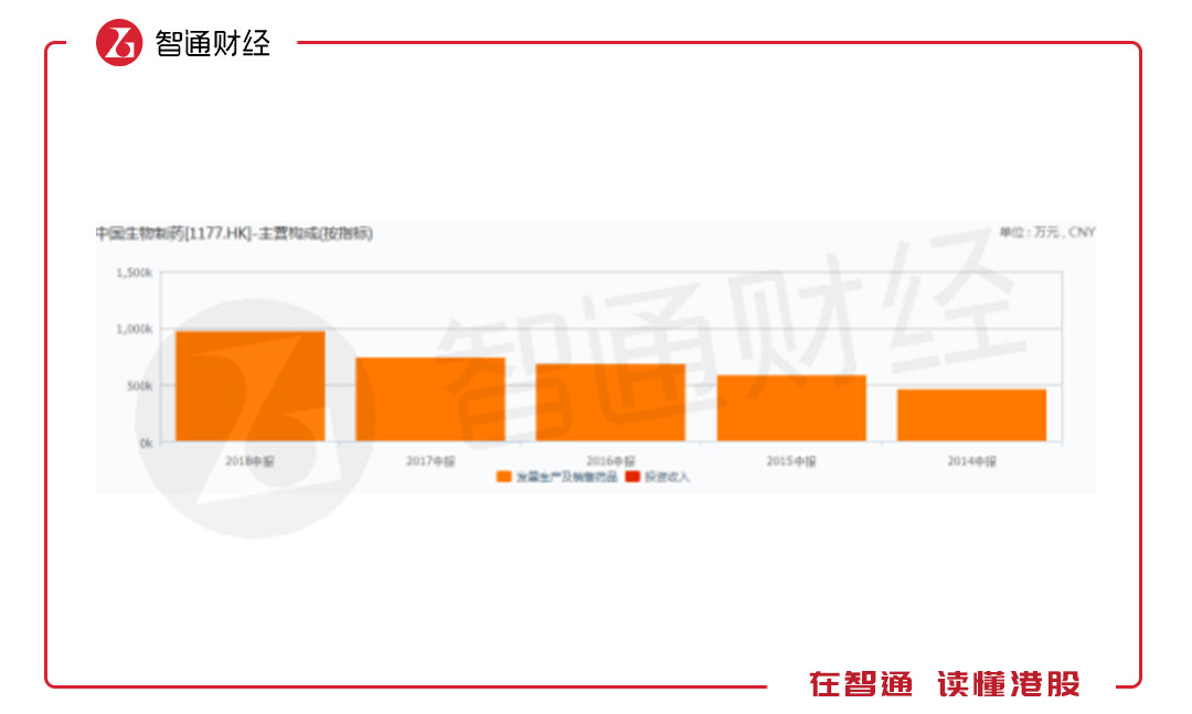 再說中國生物制藥,2018年中期的收入是97.25億,同比增長30%;歸屬于母公司持有者應占盈利約13.66億,同比增長24.1%。期間計入權益投資和金融資產未實現公允價值利潤及虧損和海外匯兌差異凈額前,歸屬于母公司持有者應占盈利約14.27億元,較去年同期增長約41.9%。