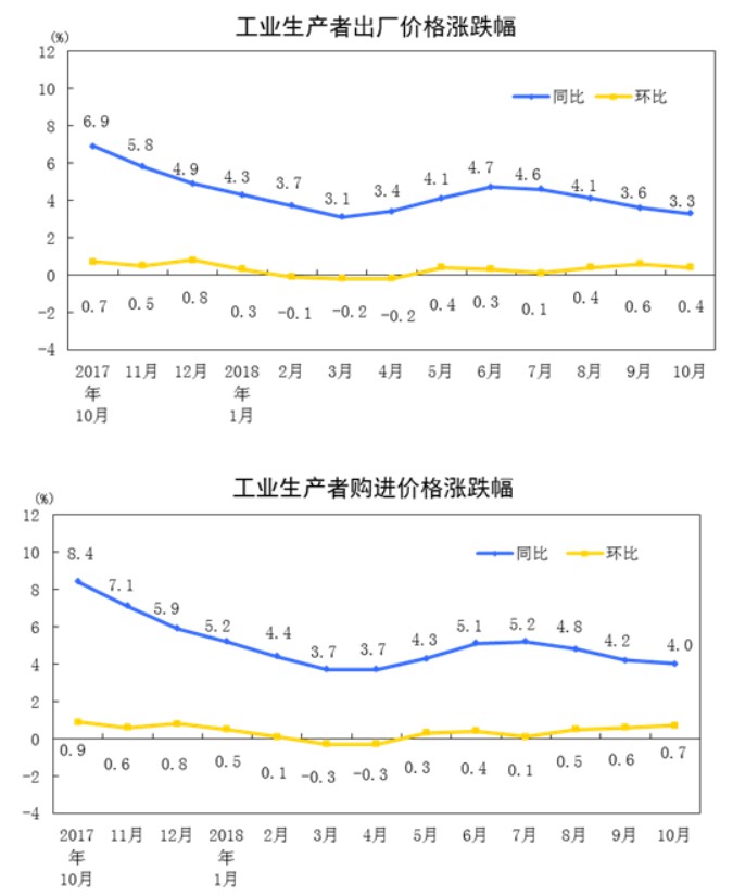 2018年10月份,全國工業生產者出廠價格同比上漲3.3%,預期3.3%,前值3.6%。環比上漲0.4%,前值0.6%。工業生產者購進價格同比上漲4.0%,環比上漲0.7%。1-10月平均,工業生產者出廠價格比去年同期上漲3.9%,工業生產者購進價格上漲4.5%。