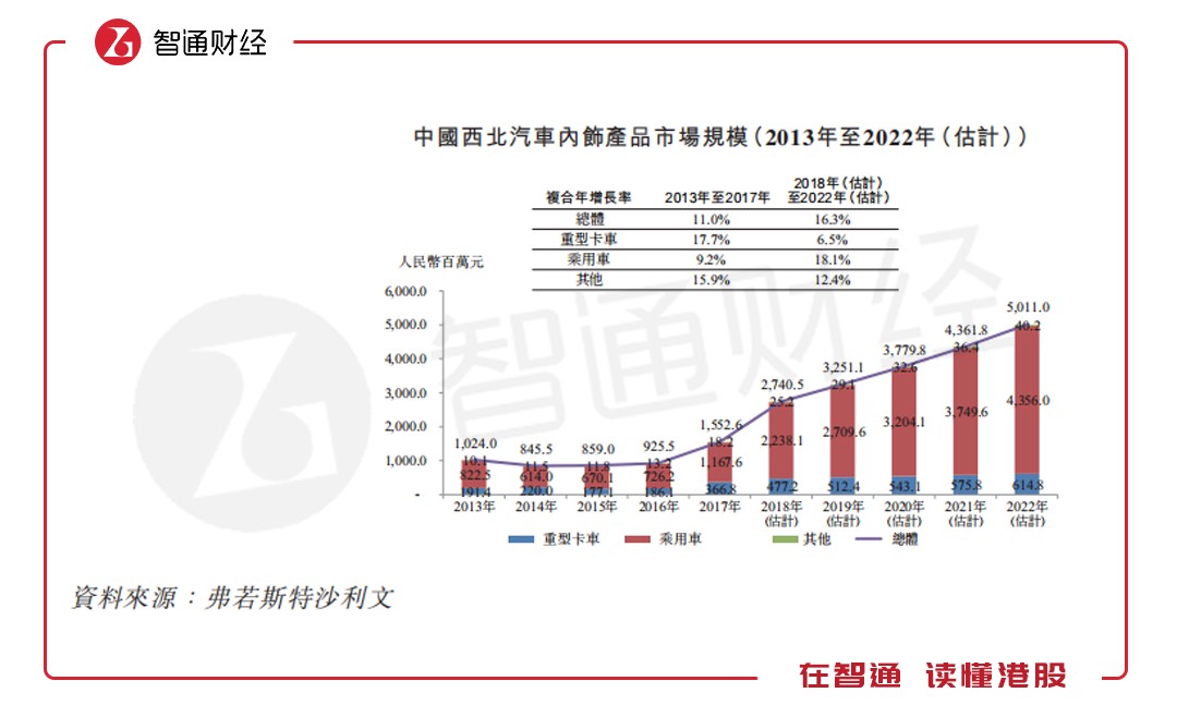 智通財經APP進一步查閱天瑞招股說明書發現,從行業來看中國汽車內飾產品市場的總值由2013年的435.7億元增至2017年的620.4億元,復合年增長率為9.2%。估計市場規模將于2022年達到942.39億元,2018年至2022年期間的復合年增長率為8.4%。