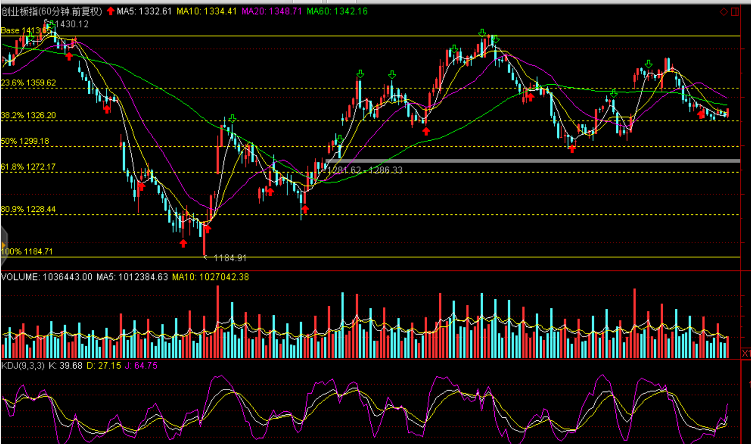 技術面:短期企穩回升,弱勢反彈,60分鐘黃金分割線滬綜指2604點、2641點、創業板1360點一線存在壓力。