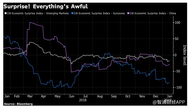 兩位分析師表示,歐洲和新興市場的經濟驚喜指數均陷入負值區間。而標普500指數成份股公司約有三分之一的營收來自海外,海外市場的進一步疲軟可能最終會令美國國內的增長前景變得黯淡。此外,美國國內的經濟增長前景在一定程度上也已經因美國政府部分關門而減弱。