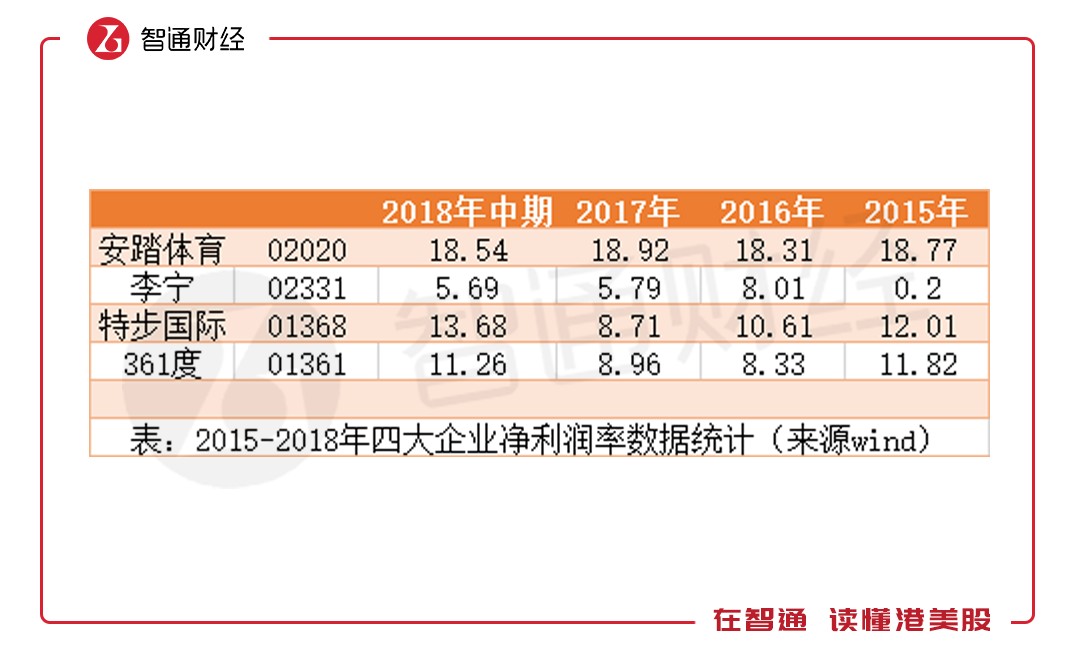 然而,高毛利優勢并未在利潤中體現。2015年時,李寧的凈利潤率為0.2%,2016年時上升至8.01%,2018年上半年時,安踏、特步、361的凈利潤率分別為18.54%、13.68%、11.26%,均遠高于李寧的5.69%。