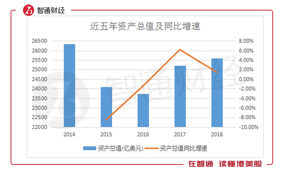 2018年,匯豐控股資產總值規模達26341.39億美元,較2017年同比增長1.44%,增速有所放緩。追溯歷史,匯豐控股總資產規模下降開始于2012年,自2015年起降幅縮小,并重新擴表。至2017年達到大幅正增長,而于去年增速放緩。