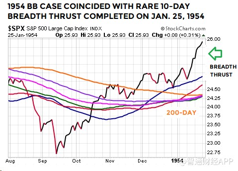 1954年1月25日時的廣量沖力指標如下圖所示,在4個交易日前,布林通道月線圖出現前述形態。與2019年相似的是,當時的點位接近200日均線的水平: