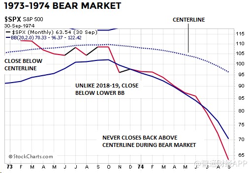 下圖是1973-74年時的情形,標普500指數在整個熊市期間都無法重新回到布林通道中軌之上。與2019年(即到目前為止)不同的是,1973年11月標普500指數收于下軌以下: