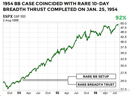 上述布林通道技術形態屬較為罕見的類型。值得注意的是,1954年和1991年時的另一技術指標,廣量沖力指標,基本上與2019年1月21日出現的廣量沖力指標形態類似。因此,在1954年、1991年和2019年,標普500指數走出了布林通道及廣量沖力指標都相似的技術形態。
