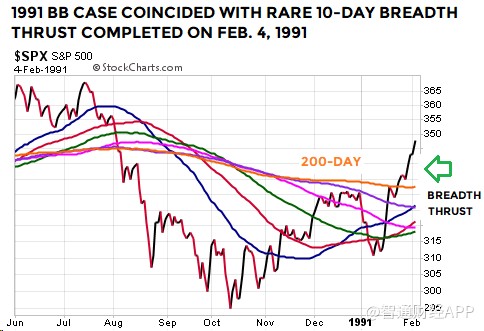 1991年,這兩種技術形態同時出現,隨后標普500指數走出了非常理想的升勢: