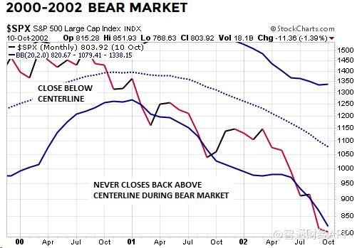 在2007年10月股市見頂之后,標普500指數在2008年1月收于布林通道月線中軌以下,在熊市期間都無法重新回到布林通道中軌以上。2008年6月標普500指數收于下軌以下: