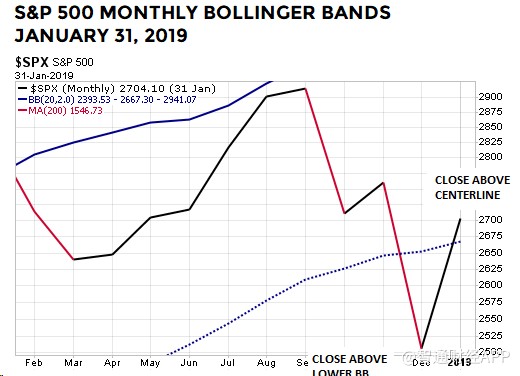 下圖顯示了標普500指數1月31日收于布林通道月線中軌上方。標普500指數在12月收于中軌以下,但在1月份便開始反彈,并成功回到中軌以上: