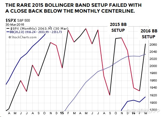標普500指數從布林通道月線中軌以上跌至中軌以下,然后再反彈收高于中軌以上,并在此期間一直維持在下軌以上,這是標準普爾500指數相對少見的走勢,而這正是2018年至2019年發生的情況。