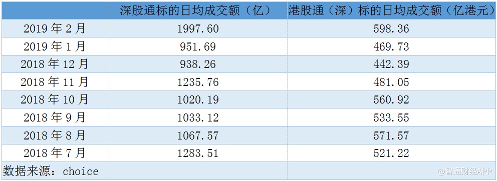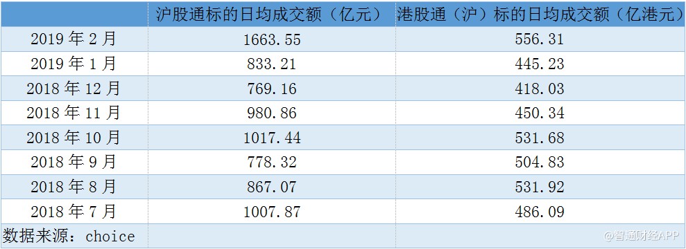 伴隨著股市上漲的,是兩地資本互通的熱度。據智通財經APP統計,北上資金方面,2019年2月,滬(深)股通標的日均成交額分別為1663.55億、1997.6億;南下資金方面,滬(深)港股通日均成交額分別為556.31億、598.36億,均相較于其他月份顯著放大。