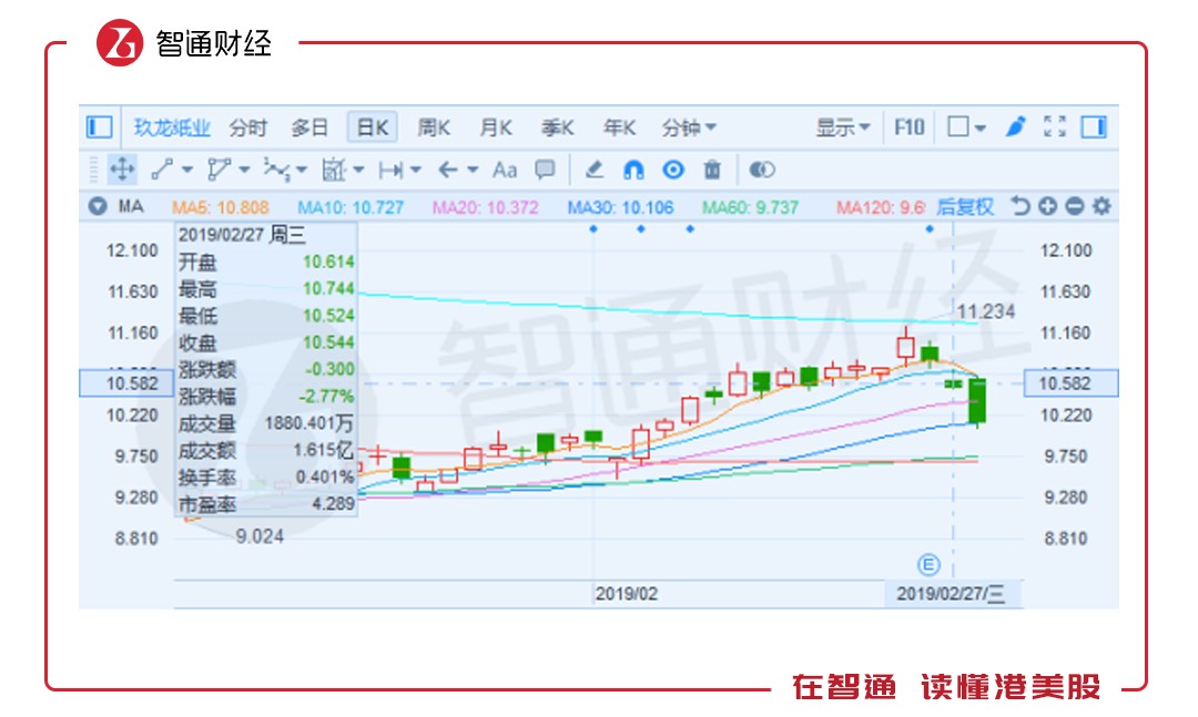 自周一港A股暴漲之后,玖龍紙業(yè)(02689)股價便已經歷連續(xù)三天下跌。2月27日,公司召開業(yè)績會當天,公司股價收報10.54,跌2.77%;28日續(xù)跌4.68%至8.14港元。