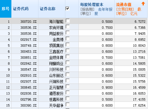 據統計,今年高送轉(10送5以上)個股共41只,其中流通市值20億一下的共計15只,列舉出來,供投資者參考。