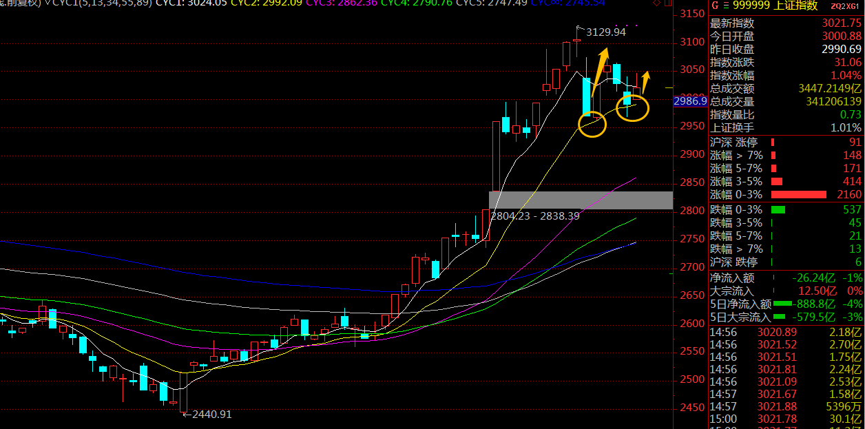 如果能在2938點企穩,則后續行情相對樂觀,也可以在較短時間內完成調整。同時,結合日k圖的成本均線指標看,兩次回踩十天成本均線,反彈力度呈現出減弱的趨勢,這地方走出第一種走勢的概率大大增加(跌破2938點)。