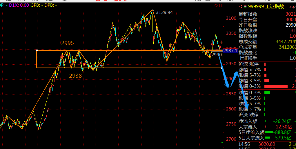 滬指最終選擇了在這個位置進行級別擴張,這里正式進入30分鐘級別的盤整走勢,那么2938點顯得非常關鍵,跌破該位置后,反抽若不能重新站上去,將繼續往下擴大調整空間。