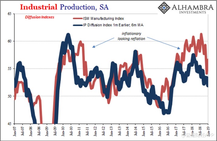 美聯儲計算了一個擴散指數(滯后一個月,即更新后的擴散指數為2019年1月)作為其工業生產數據的一部分。月度數據表現不穩定,但平均而言在時間和解讀上是明確無誤的。即使是ISM制造業的PMI的走勢也幾乎跟隨美聯儲擴散指數。