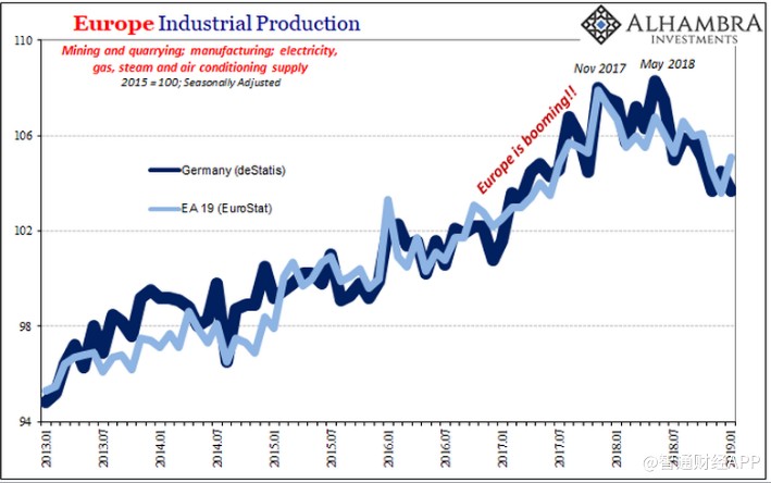 歐盟統計局對整個歐洲工業生產的估計,包括從德國收集的工業生產和重新利用的工業生產數據顯示,歐洲的產量在過去三個月中(11月、12月、1月)同比增速均出現下降,觸及2012 -13年經濟衰退以來低點。