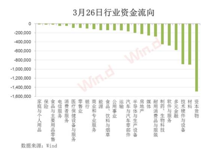 3月26日行業(yè)主力資金流向來看,所有行業(yè)均出現(xiàn)凈流出,累計(jì)凈流出逾700億元。其中,資本貨物流出最多,超過140億元;材料、技術(shù)硬件與設(shè)備、多元金融板塊凈流出均超過50億元。