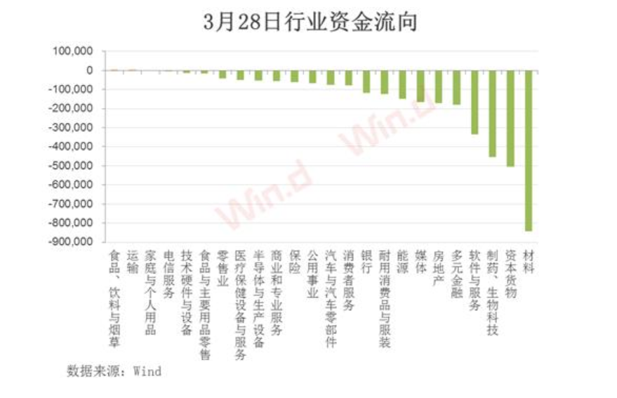 從3月28日行業主力資金流向來看,絕大多數行業出現凈流出,累計凈流出逾350多億元。其中,材料板塊流出最多,超過80億元;資本貨物、制藥與生物科技板塊凈流出均超過40億元。