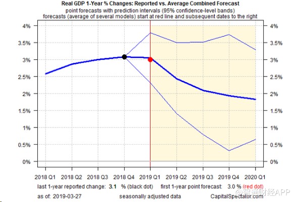 每季度更新的GDP同比數據趨勢也表明,美國經濟出現下滑?!顿Y本觀察家》通過一系列綜合預測得出的平均預測值顯示,今年第一季度的同比增幅將從去年第四季度的3.1%小幅降至3.0%,并在未來幾個季度繼續走軟。如果預測無誤,這一同比增幅將出現自2016年第二季度以來的首次下降。