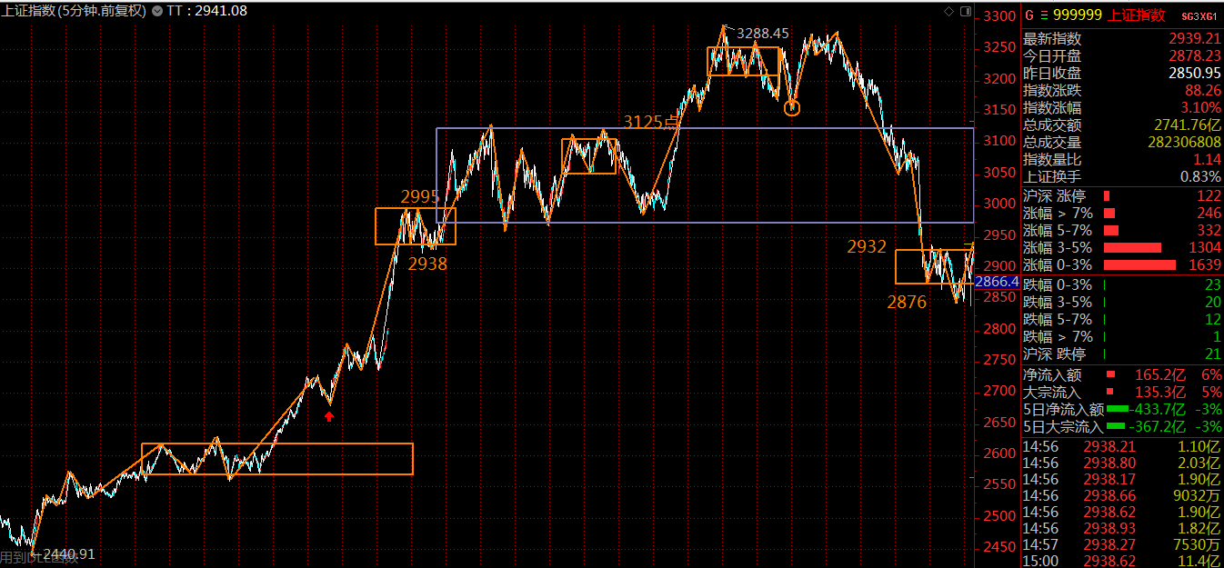 再看5分鐘級別走勢結構,在特朗普的幫助下,這里直接跌穿了三月份構建的三十分鐘級別中樞,力度較大。周五逆轉趨勢后,在三十分鐘中樞下面,完成了這段下跌趨勢第二個五分鐘中樞的構建工作。大概率宣告了這段五分鐘下跌趨勢的終結。下周一、周二,上證指數面臨了上方30分鐘中樞下軌2968點的反壓,可能會出現回落,投資者可逢低吸納。