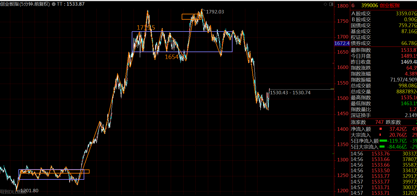 創業板這里走勢結構粗暴直接的多,目前已遠離上方的三十分鐘中樞,壓力位在上方中樞下沿1616點附近,空間較大。相對來說,短期小票走勢可能會強一些。