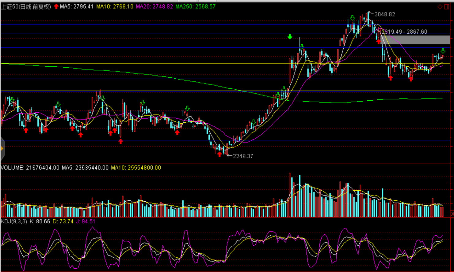 技術面:量能萎縮至近4個月新低,中短期均線系統粘合,短期股指有望向區間上軌反彈;滬綜指2950點、創業板1500點、上證50于2840點一線存在壓力。