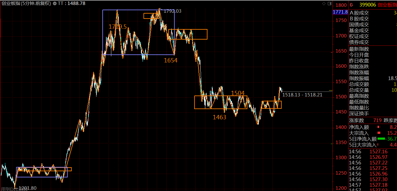 創業板空間可能相對較大,壓力位在1654點附近,這里同樣是處在五分鐘上漲趨勢中,耐心持股待漲,直至出現五分鐘趨勢背馳為止。
