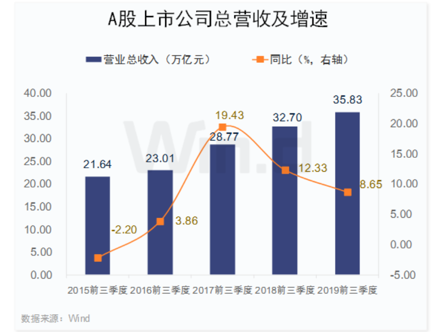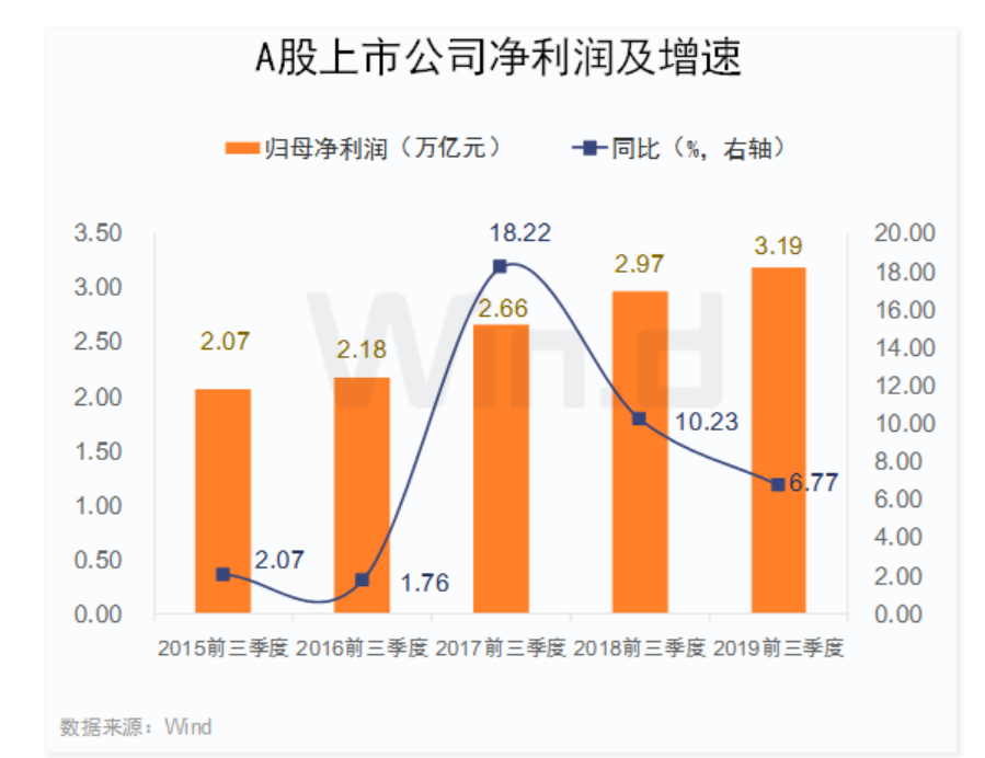 2019年前三季度A股上市公司合計實現營業總收入35.83萬億元,同比增長8.65%;實現凈利潤(備注:以下統計均為歸屬母公司凈利潤)3.19萬億元,同比增長6.77%。