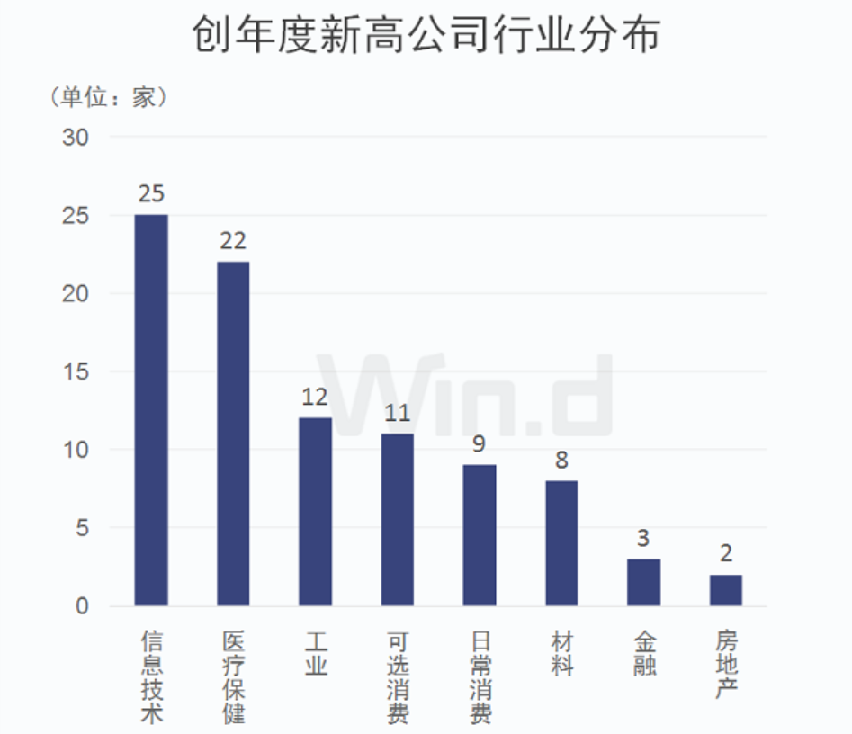 Wind統計顯示,有92家公司近3日最高股價創今年以來新高。從相關公司行業分布來看,信息技術類最多,有25家;醫療保健行業緊隨其后,有22家,工業、可選消費均有超過10家公司??梢?,科技和生物醫藥類公司成為牛股聚集地。