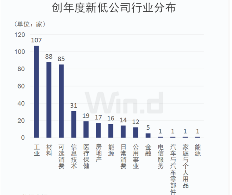 Wind統計顯示,有395家公司近3日最低股價創今年以來新低。從相關公司行業分布來看,工業最多,有107家,材料和可選消費均有超過80家。可見,雖然股指整體上漲,但傳統工業、材料領域投資者普遍不太看好。