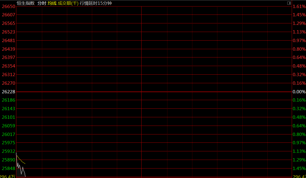 恒生指數開盤跌0.10%,報25576.279點。國企指數跌0.12%,報10418.55點。紅籌指數漲0.31%,報4208.26點。大市盤前成交16.32億港元。