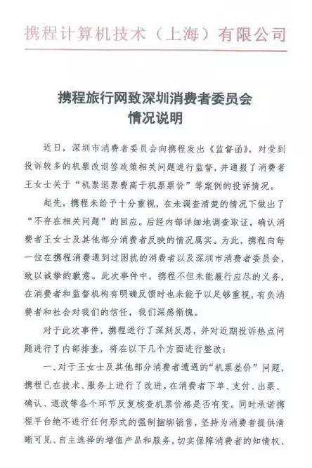 第一,?攜程公司從起初否認存在相關問題,到今天的公開道歉并提出實質性整改措施,從推責諉過到直面解決,深圳消委會對攜程公司前后態度和做法的轉變給予肯定。