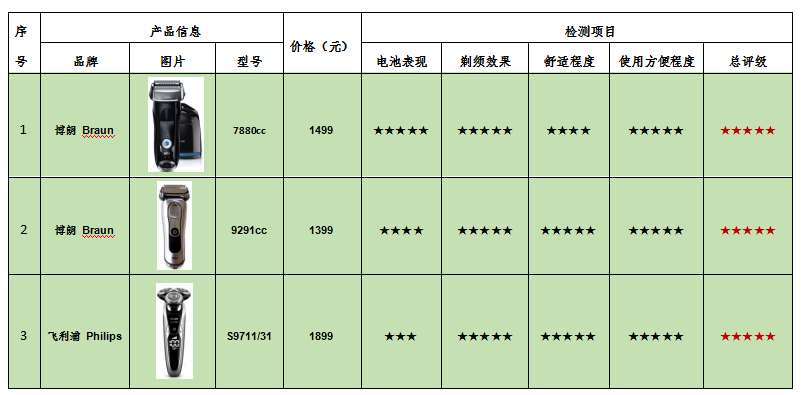 在本次比較試驗中,電動剃須刀剃須效果綜合評分最高的是飛利浦 Philips S9711/31,其次是博朗 Braun9291cc;舒適程度方面,飛利浦 Philips S9711/31表現最佳,松下 Panasonic ES-LT2得分最低;而在使用方便程度上博朗 Braun9291cc得分最高,其次為飛利浦 Philips S9711/31;在電池表現上,充滿電后可使用時間最長的是博朗 Braun7880cc (3小時12分鐘),以使用一次五分鐘來算,大約可使用30次左右;充滿電后可使用時間最短的是松下 Panasonic ES-LT2(0小時33分鐘)。