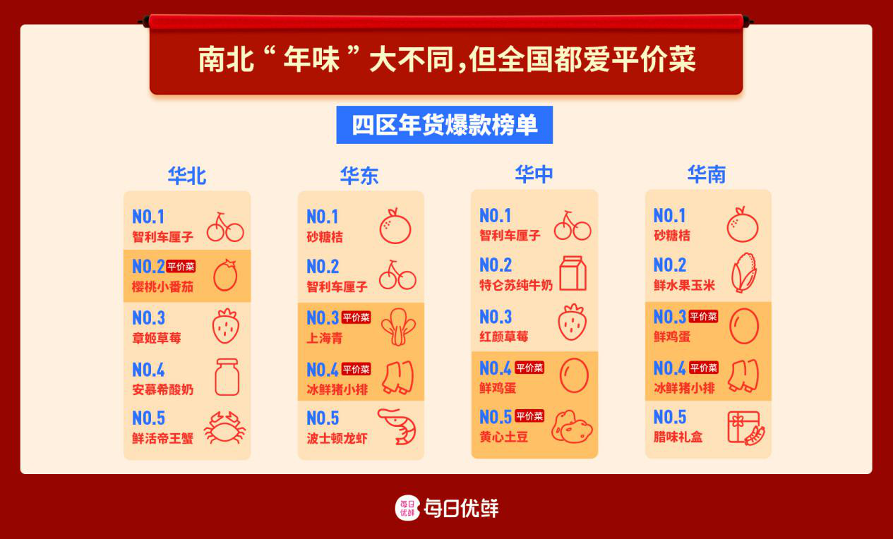 追求年輕化、精品化的華南消費者在年貨消費上也有精打細算的一面。在每日優鮮的四區年貨爆款榜單里,平價親民的鮮水果玉米、鮮雞蛋就被不少華南用戶“加車”,而這些食材的定價,也和春節期間菜價波動形成了反差。
