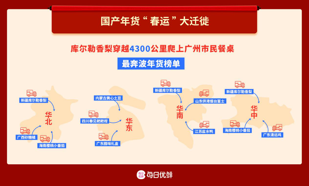 而對華南消費者來說,新疆庫爾勒香梨、吉林鮮人參、山東供港煙臺富士和江蘇鹽水鴨則是他們年貨購物車里的“遠方來客”。