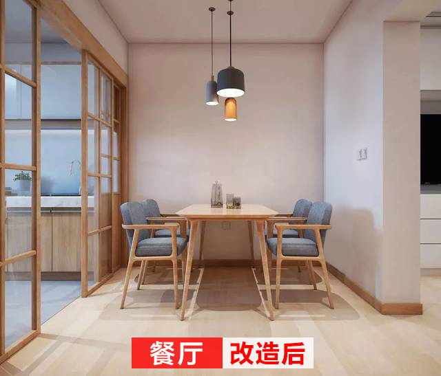 改造前的餐廳不僅僅是餐廳,還有一根晾衣繩,做晾衣區(qū);同樣餐廳也是很亂的,灰色的玻璃看起來很臟。